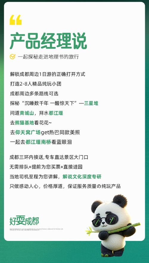 郑重承诺:公司直聘的司导团队均为成都土著,司导需通过文化知识+驾驶技能+服务礼仪三重专业培训,所有司导均需考核通过后正式上岗,并且始终坚守服务有标准,讲解有深度的准则,不做走马观花的过客,只做深耕本地的文旅向导!为您提供一站式旅行服务