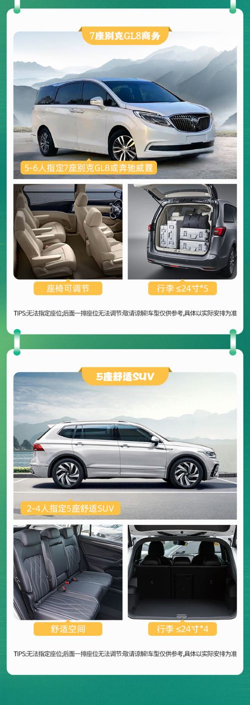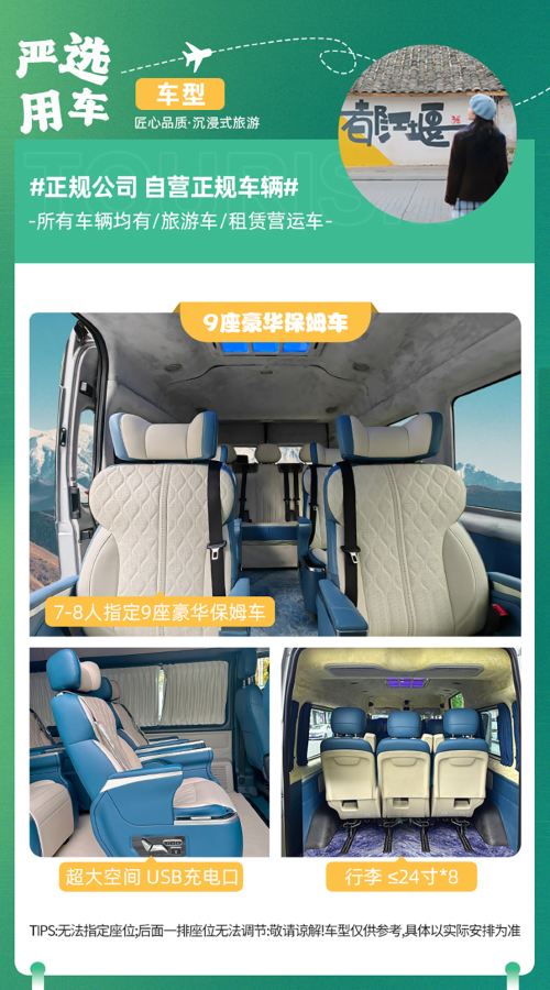 7-8人指定安排9座福特新全顺或福特全顺或9座福顺,5-6人指定7座安排别克GL8或7座奔驰威霆商务车,2-4人指定安排5座SUV或B级轿车,免费提供儿童座椅,可放行李,保证一人一正座,不指定车型,具体车型根据当天出行人数安排,拼团行程无法提前预留座位,如有特殊需求提前与客服沟通,敬请谅解!