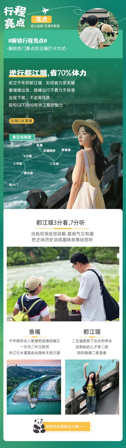 约14:30:我们特地推出司导带您从都江堰景区秦堰楼进入,俯瞰都江堰景区全貌,不走回头路,全程下坡路为主,老人小朋友轻松游览,步行轻松;秦堰楼进为您节省40元扶梯费,市场大巴团90%都是从都江堰景区玉垒阁进,自费扶梯费40元/人,大团是必须,请仔细甄别对比!