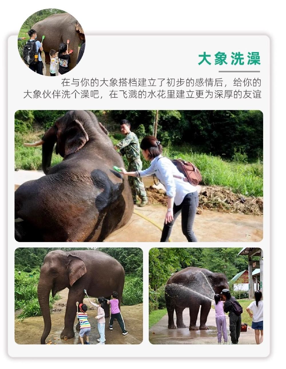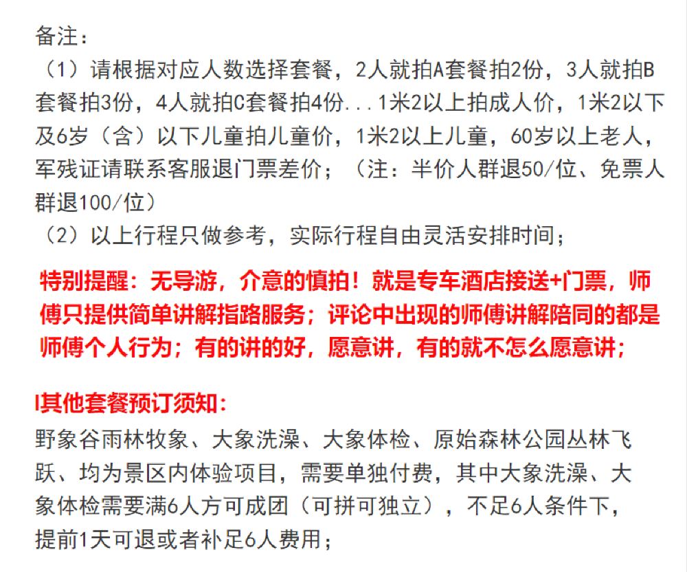 拼大象洗澡/拼大象医生预约登记只是预约登记的费用,大小同价,体验时长30分钟,需要拼满6人方可成团,不含门票和接送,由于不可控因素比较多,提前1天确定成团条件下补差价,敬请悉知;