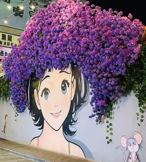 ▲ 新晋网红打卡点—俏皮可爱的美少女彩绘墙惊艳亮相。墙绘与真实花卉相结合,形成“画中花、花中画”虚实交融,少女戴着蓝紫色花冠,旁边还有卡通小猫和老鼠,仿佛走进了一个童话世界,超级出片,怎么拍都好看;很适合喜欢打卡拍照的美女小姐姐,我们哟!