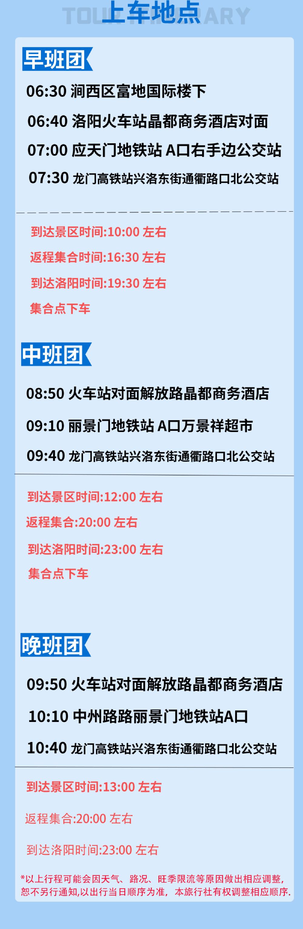 2、如遇春节,五一,十一等法定节假日或景区限流等情况,晚班车出发时间会提前1-2小时,具体以出行前一天导游通知为准
