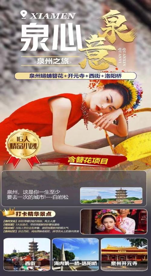 【10:00】前往浔埔村,蟳埔村位于福建省泉州市丰泽区东海社区的一条小渔村,这里居住的是古时阿拉伯人的后裔。这里的女人们头上戴着鲜花做的漂亮的簪花围,戴着丁香耳坠,穿着大裾衫、宽脚裤,形成了一道独特的风情,她们和惠安女、湄州女一起并称福建三大渔女,这里还有别具特色的民居“蚵壳厝”。体验浔埔村地方民俗,风土人情。