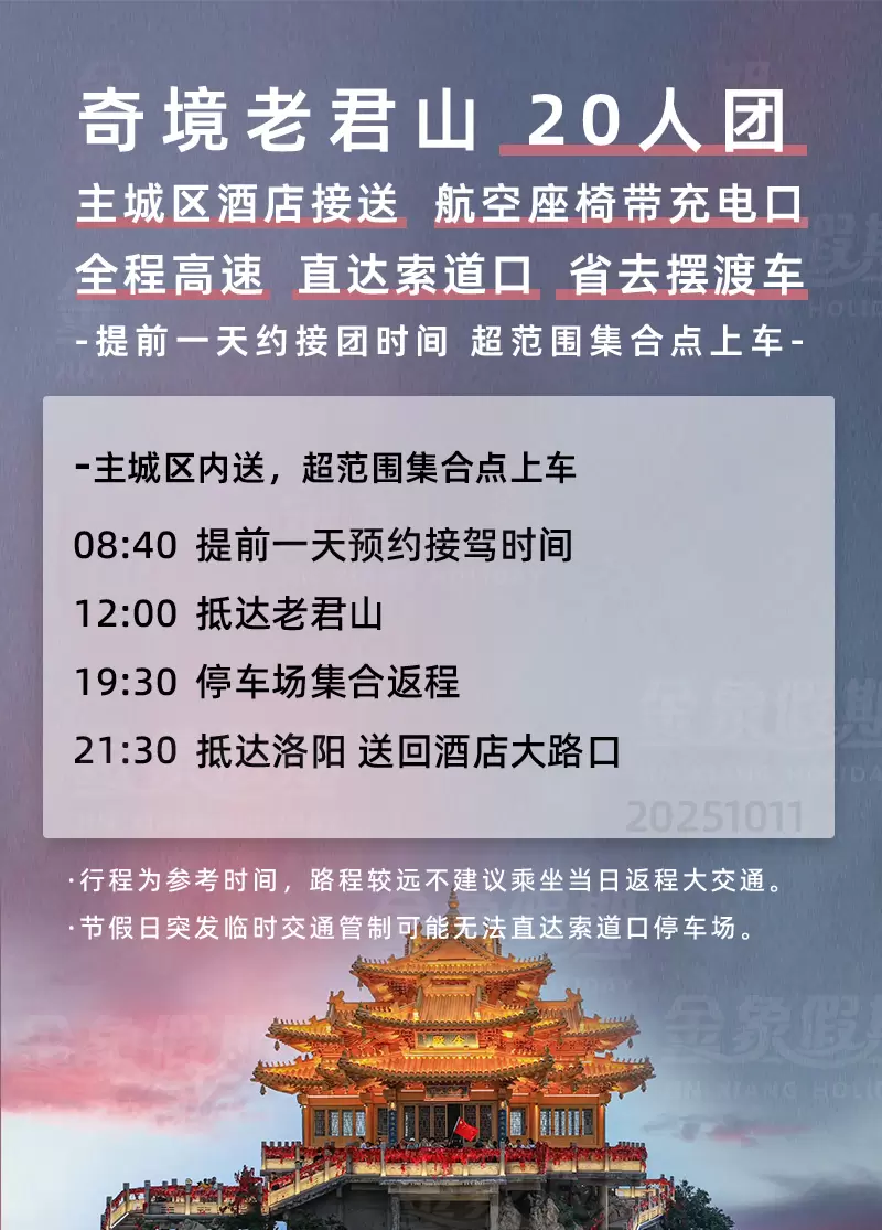 洛阳老君山景区一日游【20人团丨航空座椅带充电丨市内酒店接送丨走高速丨直达索道口】