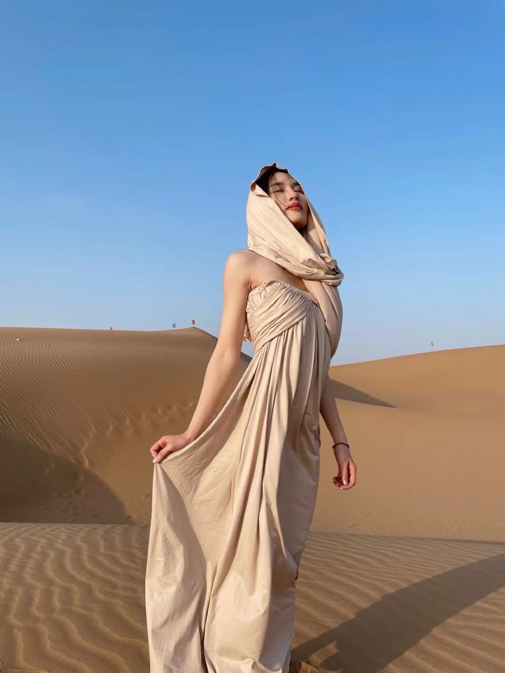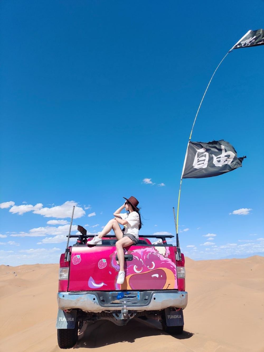 去沙漠里一定要提前做好防晒防沙保护,喜欢拍照的建议穿着白色、黑色、红色裙子,更加出片,晕车的朋友建议提前准备好晕车药