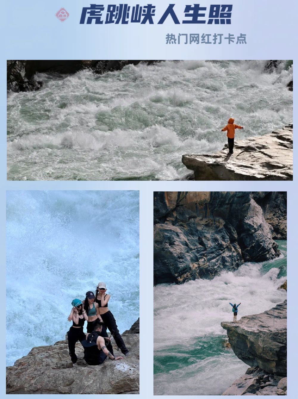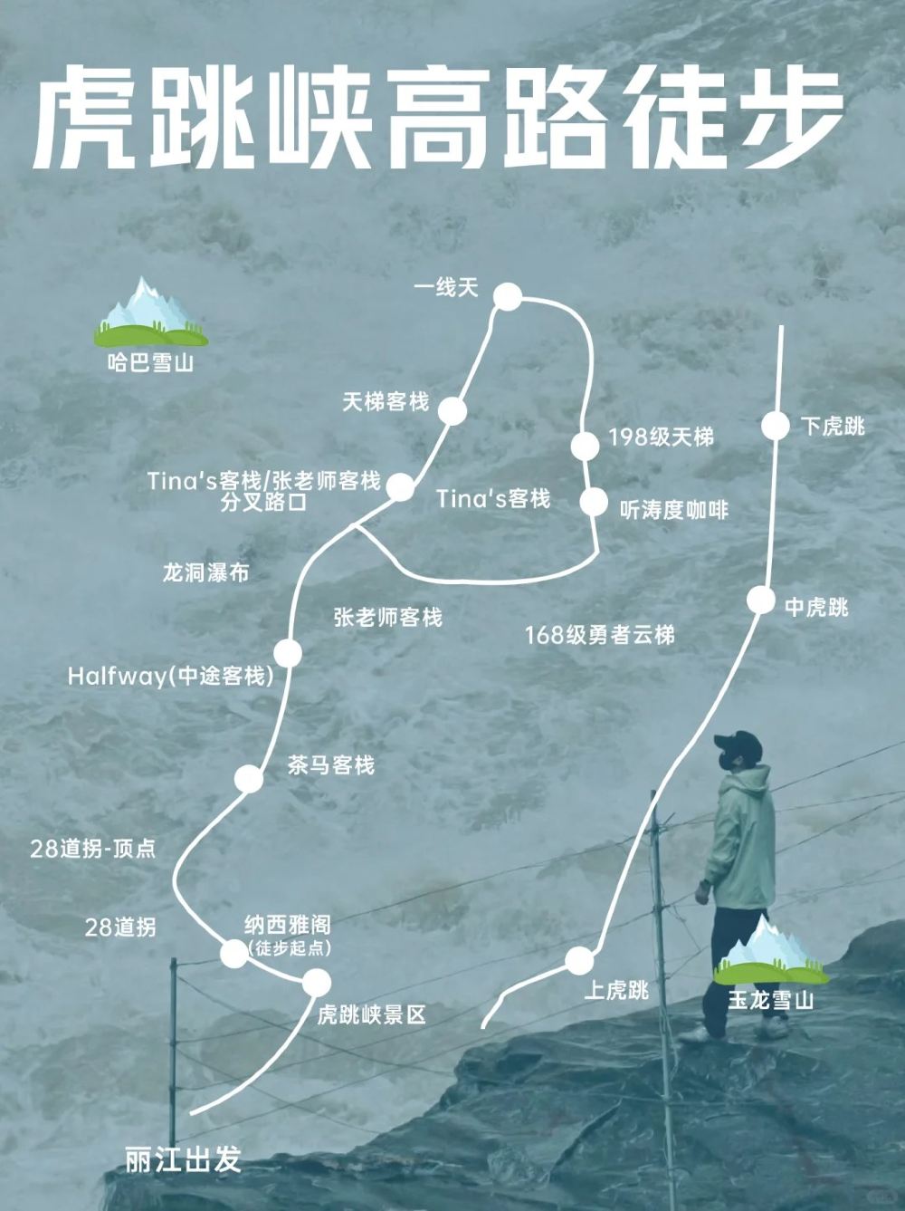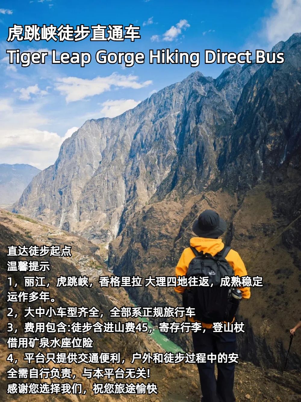 2、中虎跳坐我们的专线车不需要门票,不去上虎跳风景区就不会产生门票费用,专线车点对点发车,可选下车点有上虎跳风景区,纳西雅阁,茶马客栈,中途客栈,返程固定上车点为张老师客栈