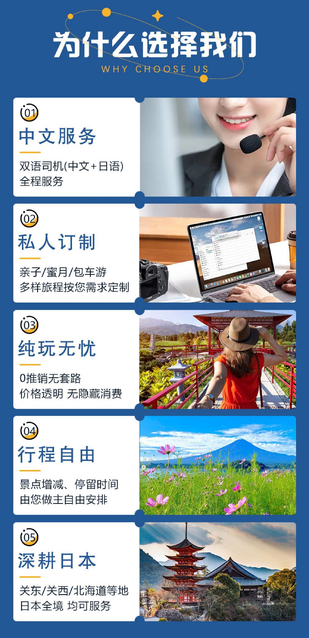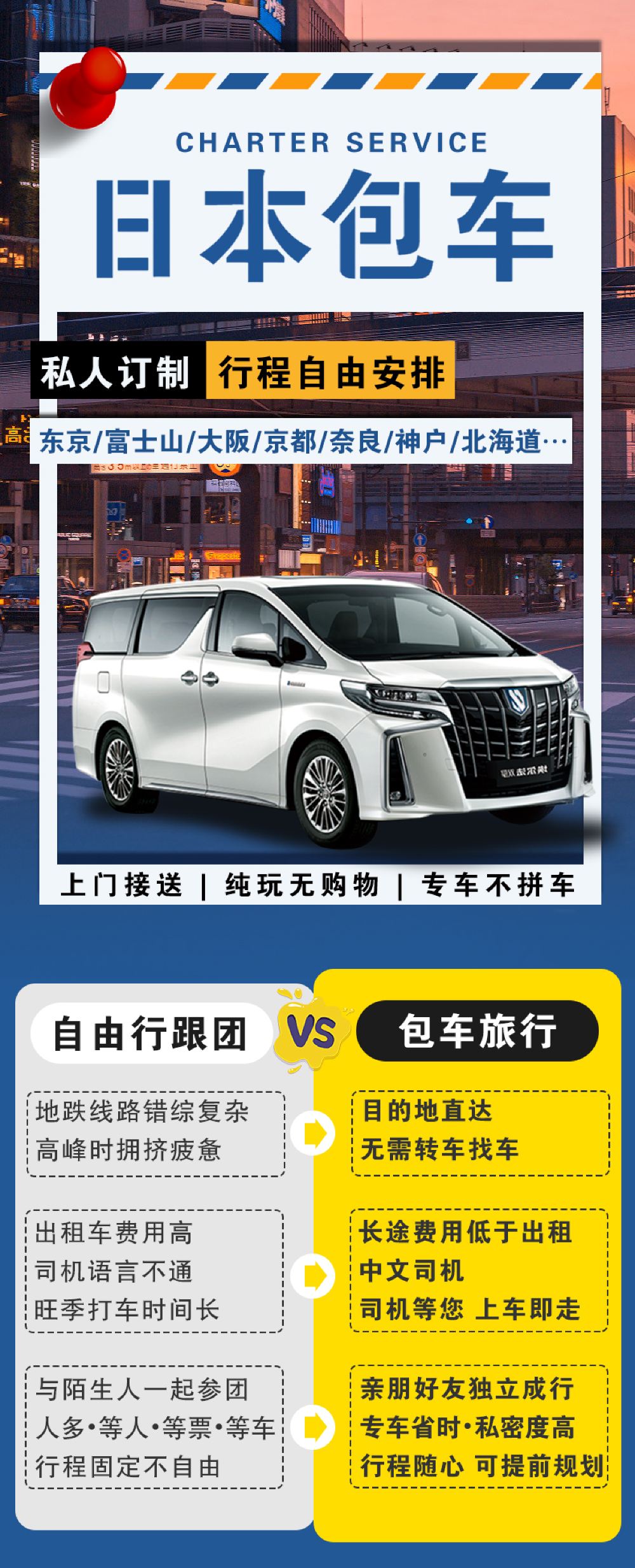 3、更多目的地包车套餐(箱根/东京/伊豆/日光/横滨等)、大阪/京都/名古屋/北海道等,均可咨询客服报价哦;