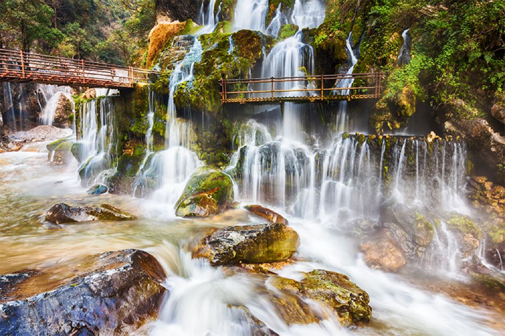 螺髻九十九里温泉瀑布,不仅是难得的温泉浴场,其水温常年保持32℃,矿化度0.192克/升,ph值为7.9属重碳酸镁型泉水,泉水无色、透明、无臭、无味,沐浴其中,好不畅快;而且是天然的皮肤病防治所。东晋人常璩所著《华阳国志》就记载了大槽河温泉瀑布:“温泉穴,冬夏常热,下流洗澡,治疾病。”