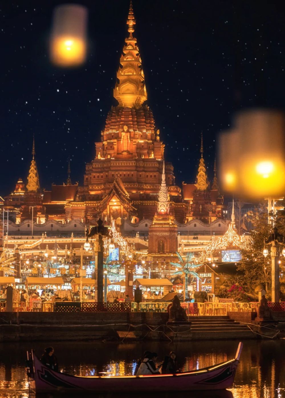 ▲ 告庄夜市,西双版纳的梦幻之地。当夜幕降临,这里就像被施了魔法。璀璨灯光下,五彩的傣式建筑熠熠生辉。