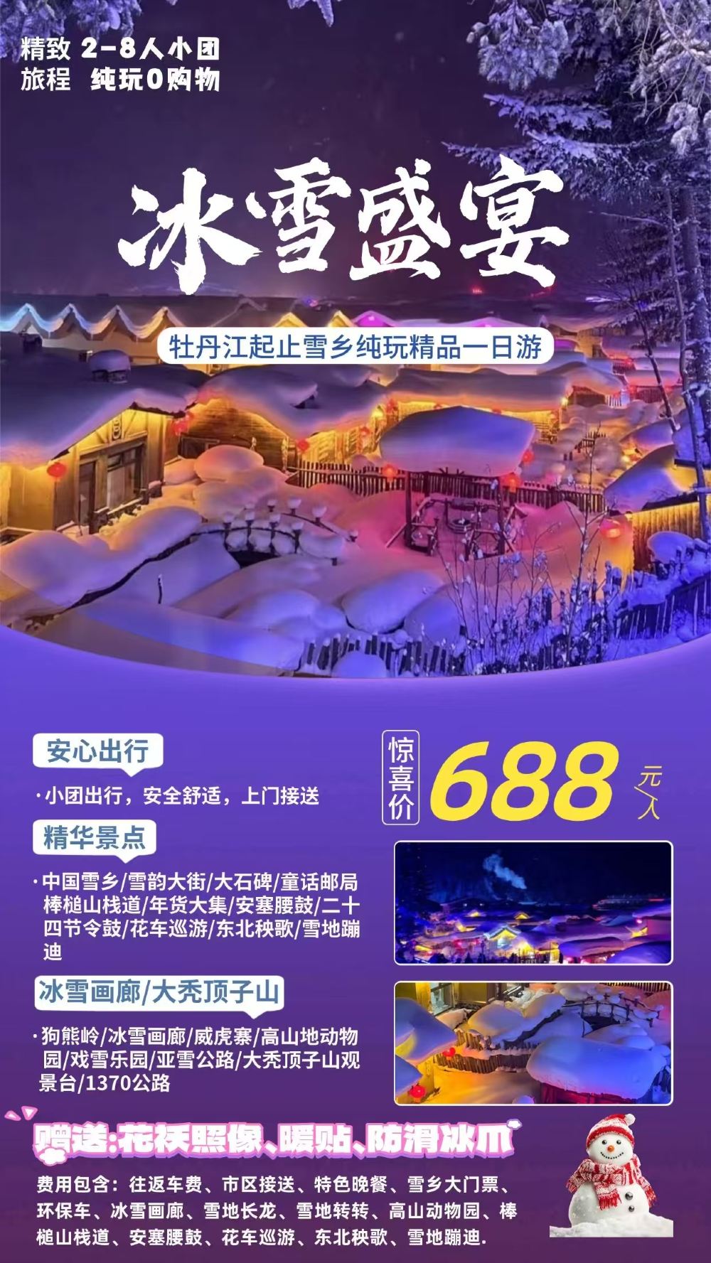 (经典线路)688元每人,价格包含:升级私家小车上门接送,市区酒店和高铁站均可。雪乡大门票140元+倒站车15;冰雪画廊门票180,雪地转转+雪地长龙80. 雪乡晚餐,含意外保险+旅游三宝(花棉袄拍照+防滑冰爪+发热鞋垫或暖宝宝)