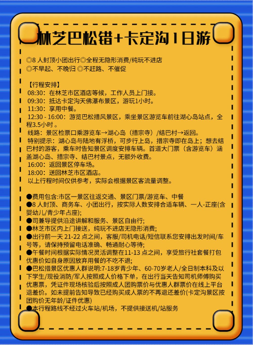 本行程到达林芝市区时间在18:30-19:30左右(特殊情况除外)不路过动车站,无法赶上林芝发往拉萨末班动车。产品大小同价,门票滚观光车有优惠,司机师傅现场退差价,全票优惠退165 ,随后自己购买景区门票观光车。- 出行前一天晚上22点后下单,需提前咨询客服确认空位。