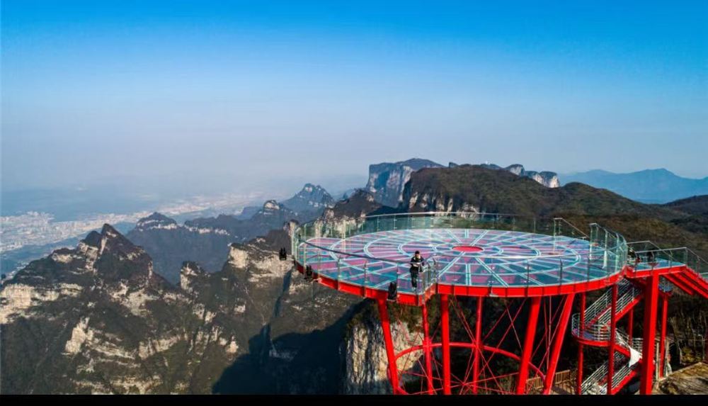 早上,我们的导游和司机将在酒店大堂与您会面,然后前往张家界的新地标——七星山。七星山是世界上罕见的喀斯特孤立峰台地地貌,四周环绕着约500至700米高的不规则峭壁。它与张家界天门山隔峡谷相望,最高海拔1528.6米。七星山顶是一个巨大的哑铃状山丘台地,平均海拔1400米,面积约32平方公里。台地上有7座较高的山峰,呈北斗七星状分布,因此得名七星山。一座名为“1520天眼”的大型红色钢架全玻璃观景台气势恢宏,可让您360度全方位欣赏峡谷奇观和城市风光。