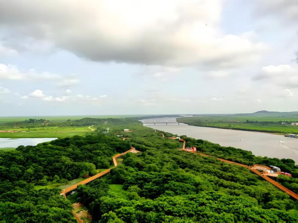 ▲ 优美的自然风光:湿地内湖泊星罗棋布,图们江蜿蜒流淌,远处是连绵的山脉