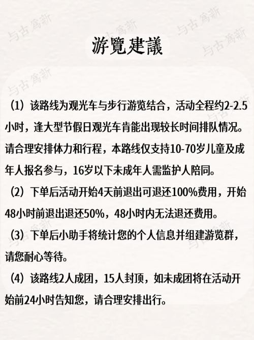 ▲ *该行程2人成行,15人封顶,6周岁及以下不收费 *下单后最晚次日客服会添加您的微信或拨打电话,请注意查看信息 *费用含观光车票不含遗址公园门票