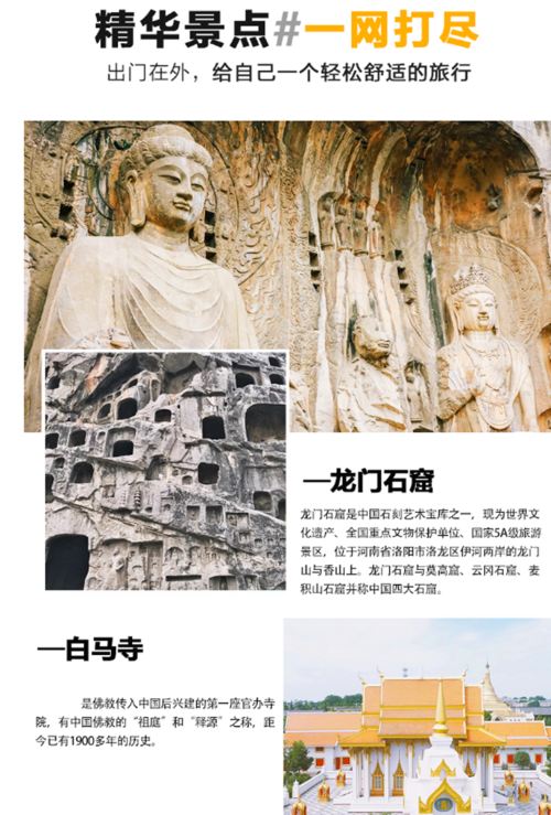 【1】、洛阳石窟是中国四大石窟之一,气势恢宏,其中卢舍那大佛雕像群,有半山高,极为震撼。大大小
