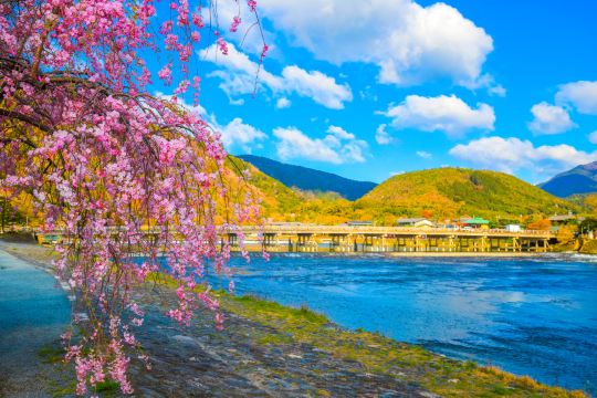 ▲ 渡月桥是京都的标志性景致。它横跨河面,连接两岸风光。春赏樱花烂漫,秋观红叶满枝,四季变换中展现出不同的韵味,桥畔的店铺与人力车更添一份怀旧的日本风情。