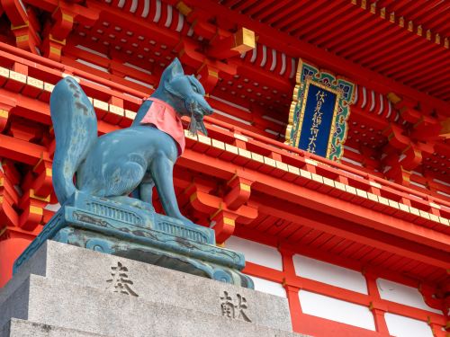▲ 伏见稻荷大社的守护神是狐狸,能见到嘴里叼着钥匙、书卷、稻穗的狐狸,它们分别掌管着财富、智慧、丰收。别忘了在此祈求好运。