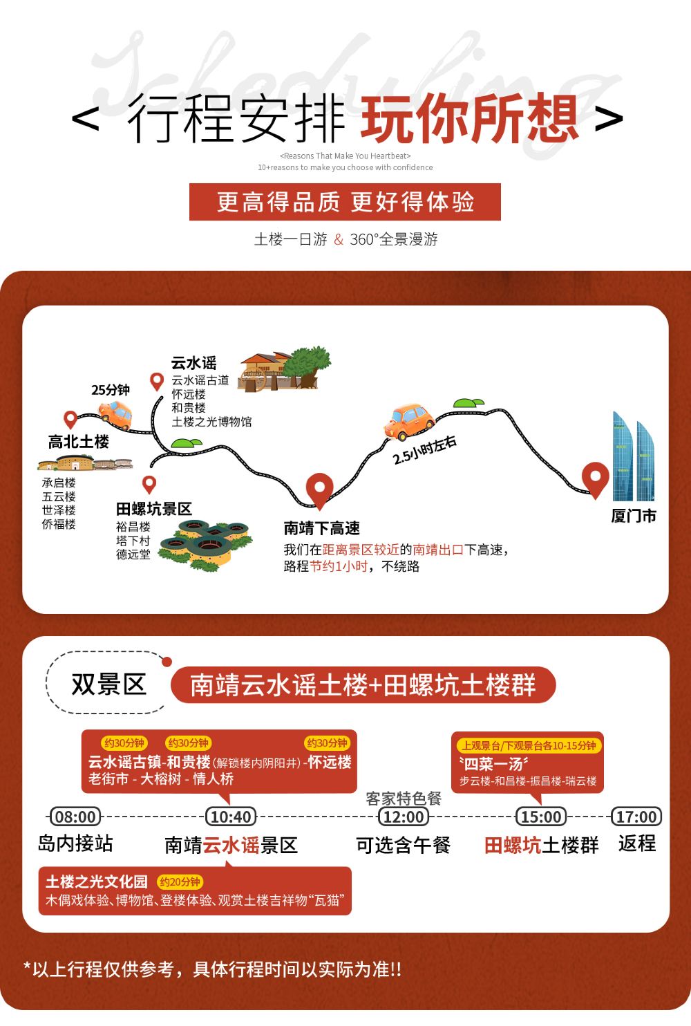 以下详情为土楼下单必读信息,不同套餐、大小团服务项目,费用包含不一样,页面行程顺序及时间仅供参考,具体以实际安排的行程时间与顺序为准。多个景点实为同一个地方,只是叫法不一样。