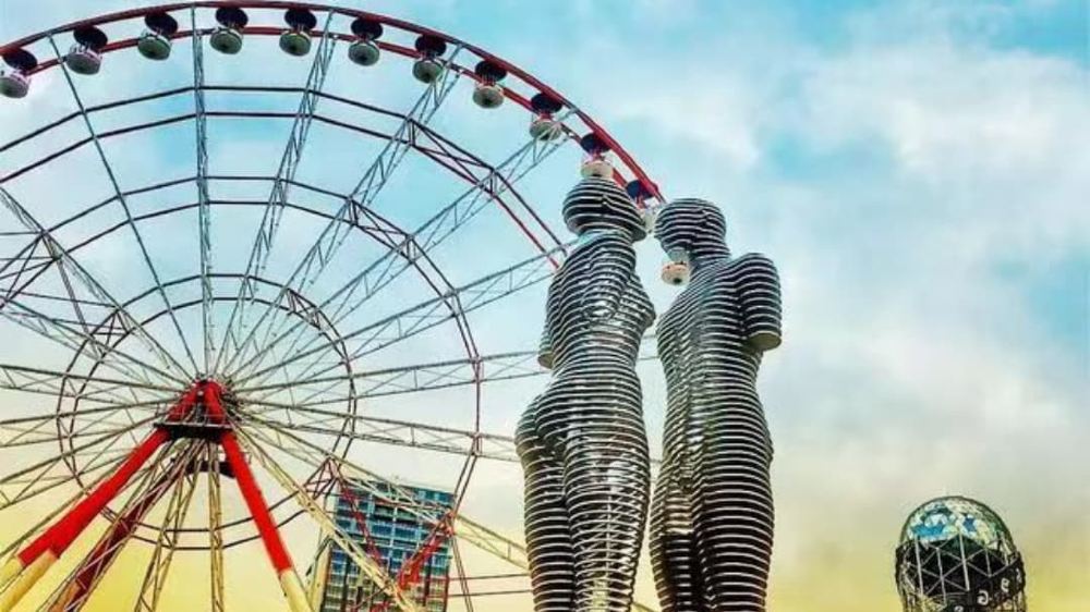 ▲ 阿里与尼诺雕像是巴统欧洲广场的标志性装置,由塔玛拉·克维捷拉什维利设计。两尊金属雕像表现 Azerbaijani 青年阿里与格鲁吉亚公主尼诺的爱情故事,每日缓慢旋转,相遇时交叠拥抱再分离,象征爱情的短暂与永恒。 周边可逛欧洲广场,看美狄亚雕像;步行至黑海沿岸,欣赏海滨风光;附近餐厅能尝格鲁吉亚红酒与奶酪饼,夜晚还有音乐喷泉表演,兼具浪漫与烟火气。