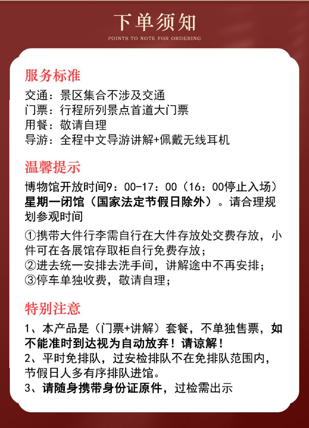 5、请按照约定时间提前10分钟抵达,迟到不等待,费用不退,谢谢~