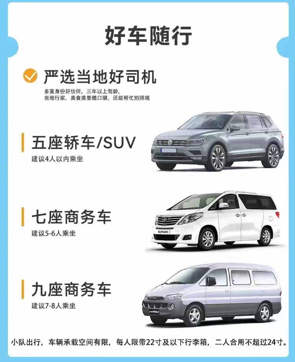 2、7座紧凑型轿车,车辆为国产五菱、北汽、宝俊等7座车,可放3个行李!用车时间为早8:00到傍晚17:00,一般时间足够不会超时。如超时1小时,不加收费用。超时1小时以上到2小时加收70元。此后每超1小时加收40元。