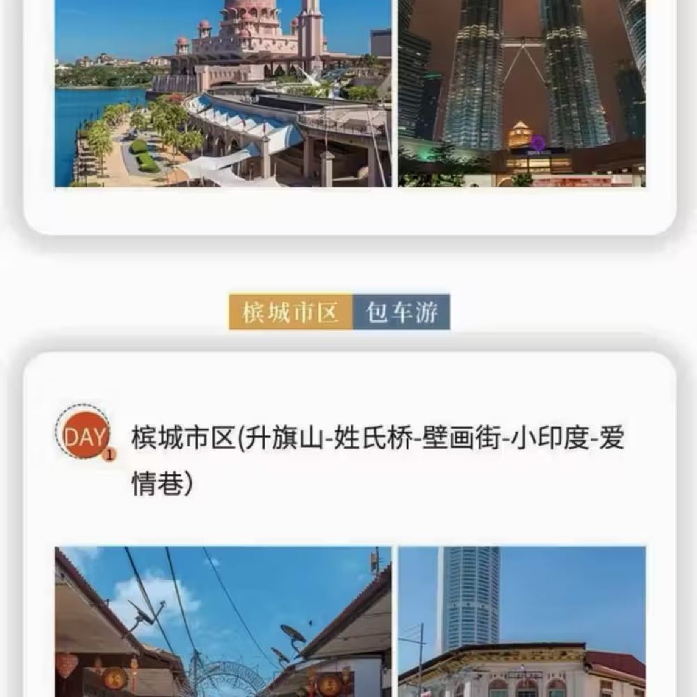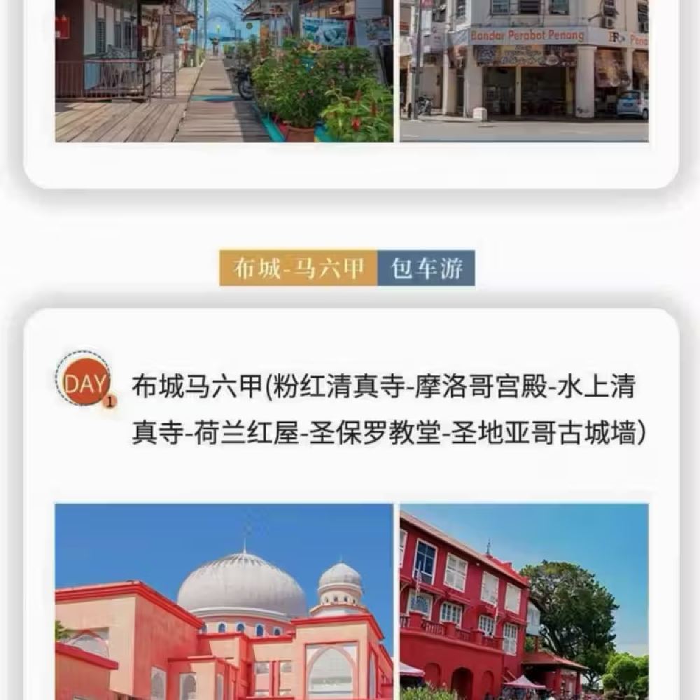 - 布城马六甲一日游:08:00左右吉隆坡市区出发-粉红清真寺(布城)-航海博物馆-马六甲河(可乘坐游船观光)-鸡场街午餐--荷兰红屋-圣保罗教堂-苏丹王宫-海峡清真寺-16:00左右开始返程吉隆坡(10小时包车)
