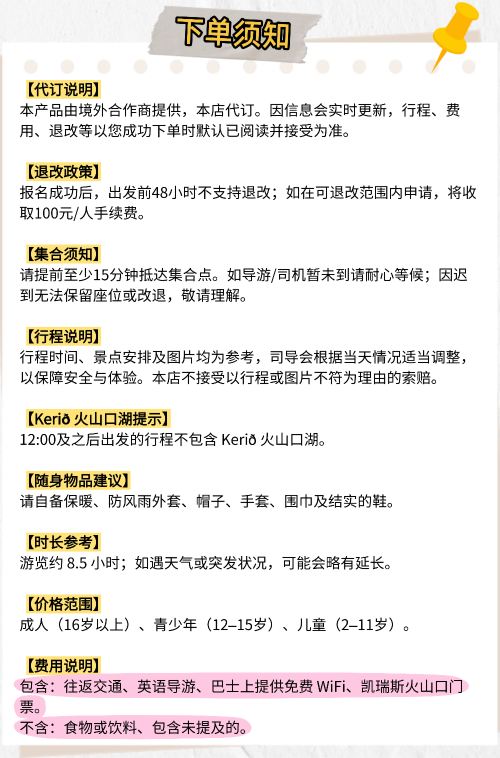 1.本产品由境外合作商提供,本店代订。由于产品信息实时更新、市场价格波动等可能会与您预订时展示的不一致。行程安排、费用说明、退改政策、其它说明等,您下单支付成功即默认您已阅读知晓并接受。