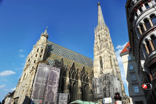 ▲ 斯蒂芬大教堂是维也纳的地标建筑,是欧洲三大教堂之一。自15世纪晚期开始,大教堂就是天主教的主教地和奥地利重要的教堂。壮美建筑大教堂由1座主体楼和3座楼塔组成,高耸的锥形尖塔直冲云霄、镶嵌着青黄拼花瓦片的彩色屋顶在阳光下熠熠生辉,瓦片组成的臂章图案以及代表哈布斯堡王朝的双头鹰十分壮观。