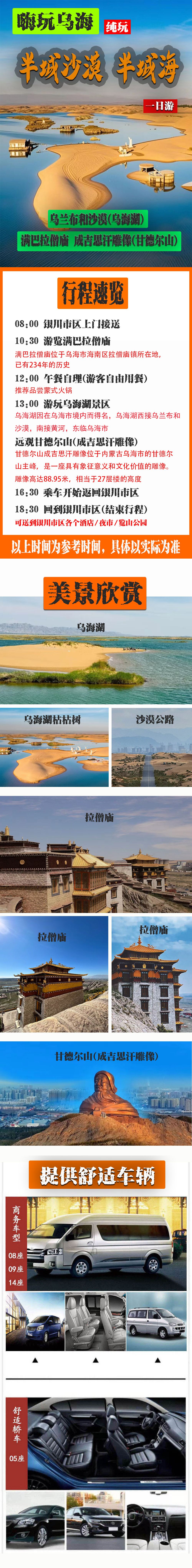 1.乌海湖景区无需门票,但是要进入到乌海湖深处需要做摆渡车或游船 (费用自理)