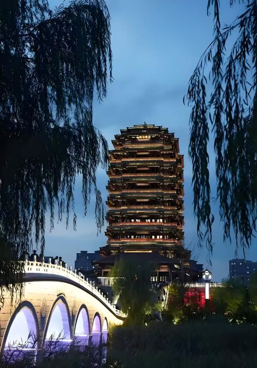 ▲ 建筑特色:采用汉代建筑风格,飞檐斗拱、青砖灰瓦,屋脊平直古朴,主体呈黑色调,彰显齐文化的雄浑大气。建筑共十层,地上九层、地下一层,总高度67米,建筑面积11642平方米,是齐盛湖公园的制高点。