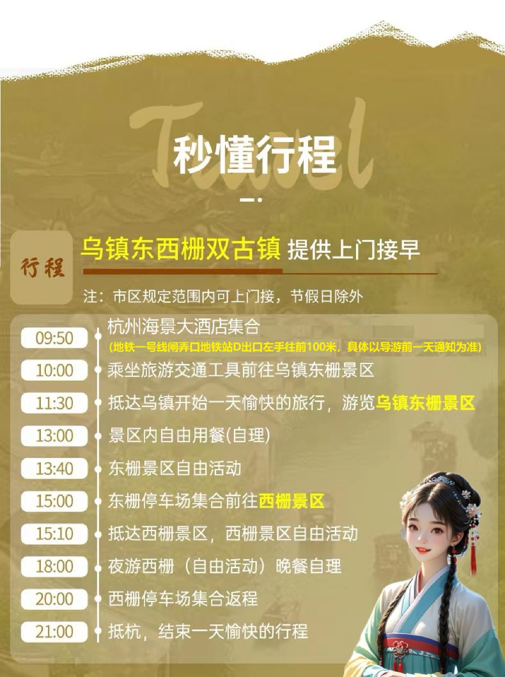 【购票说明】:成人价格为单价,包含车费,导游费,以及乌镇东栅景区和西栅景区的门票费用。儿童票的费用包含车费,不包含门票费用(儿童,学生,老人下单前可咨询客服或拨打页面上的400电话,可享受优惠票价)