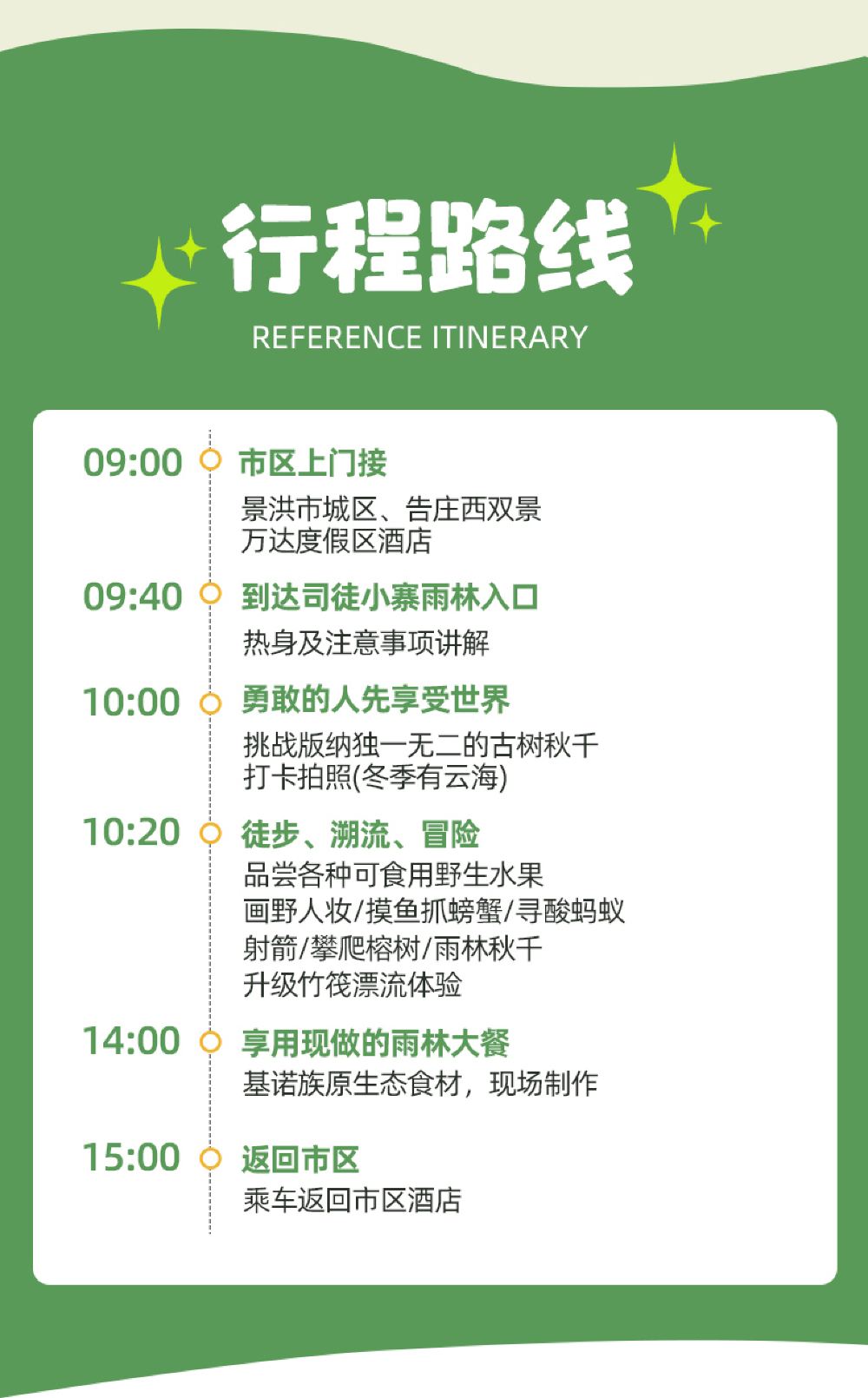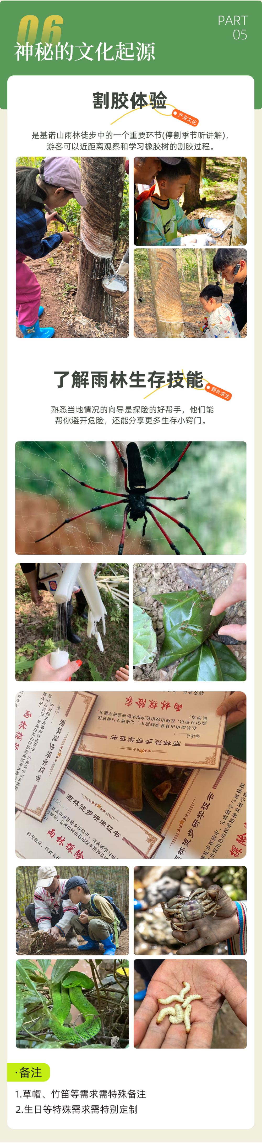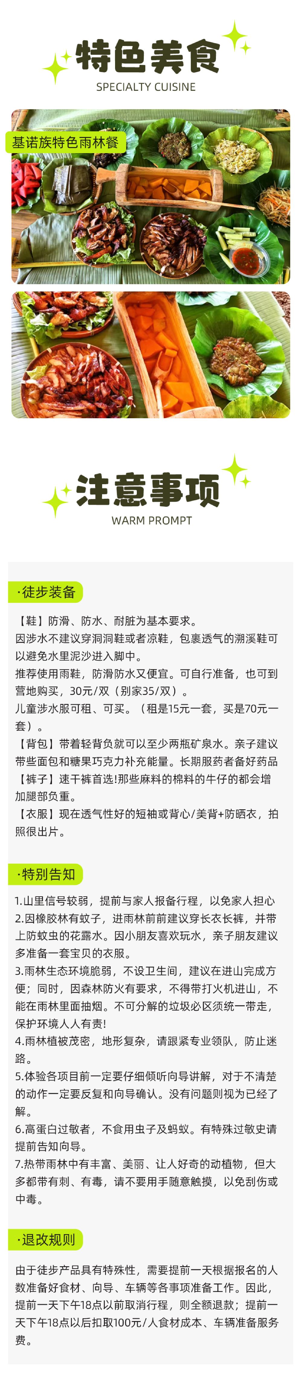 注意事项:此产品是基诺山雨林徒步,不是基诺山寨景区,不进景区游玩哟,安排下文图文详情中的司土小寨线路,对向导有要求的可以特别备注下,比如男、女,年轻点的,拍照技术好的,会带小朋友的都会尽量安排;