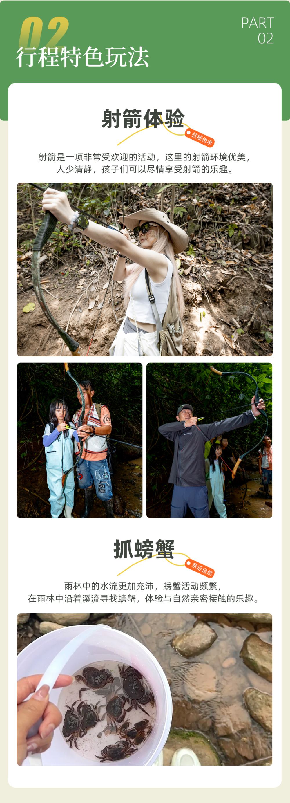11:00—14:00 开始徒步进入雨林深处(全程约4公里)。沿途随处可见巨大的板根现象、遮天蔽日的高大乔木、热带雨林独有的中草药、滴水叶尖现象、老树生花、寄生附生现象等等热带雨林奇观,约2公里左右的溯溪挑战路段,途中进行植物识别等活动。约2公里登山爬坡路段。