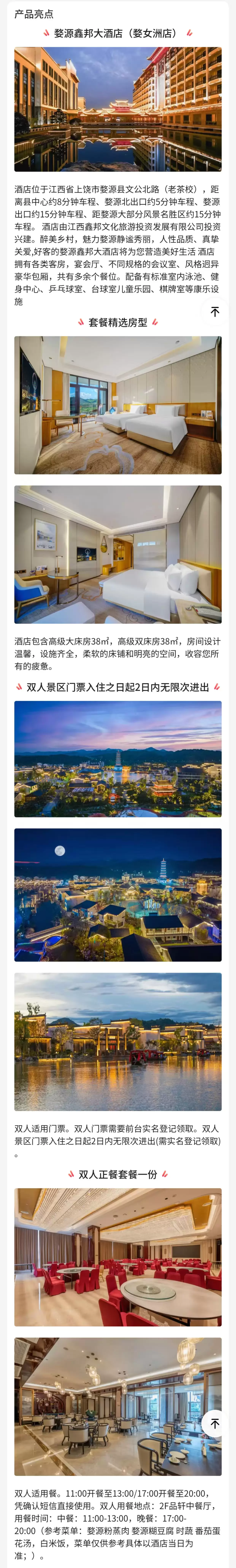 【酒店套餐】 五星鑫邦酒店阳台房1晚+双人婺女洲2天内多次入园+双早+双人正餐套餐一份