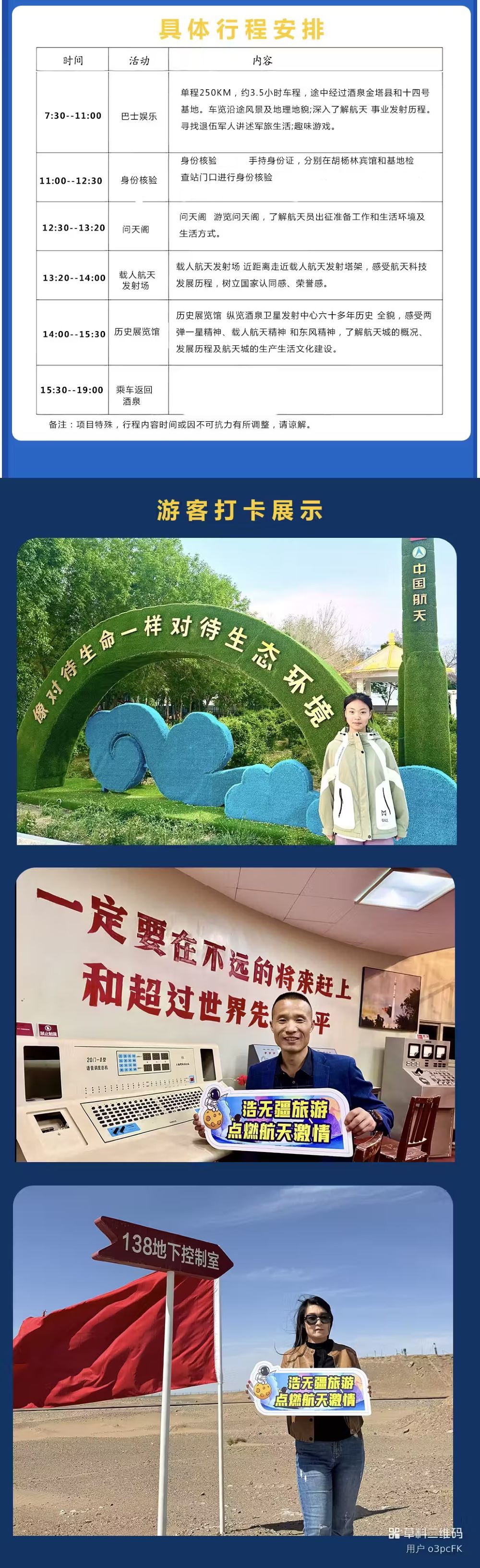 场内(线路):载人航天发射场(外围指定参观区域)、历史展览馆(周一闭馆)、问天阁(如遇重大发射项目或重大事件停止参观)、飞天公园、东风礼堂(外景),具体参观场景根据参观当天基地实际开放情况参观5选3处。