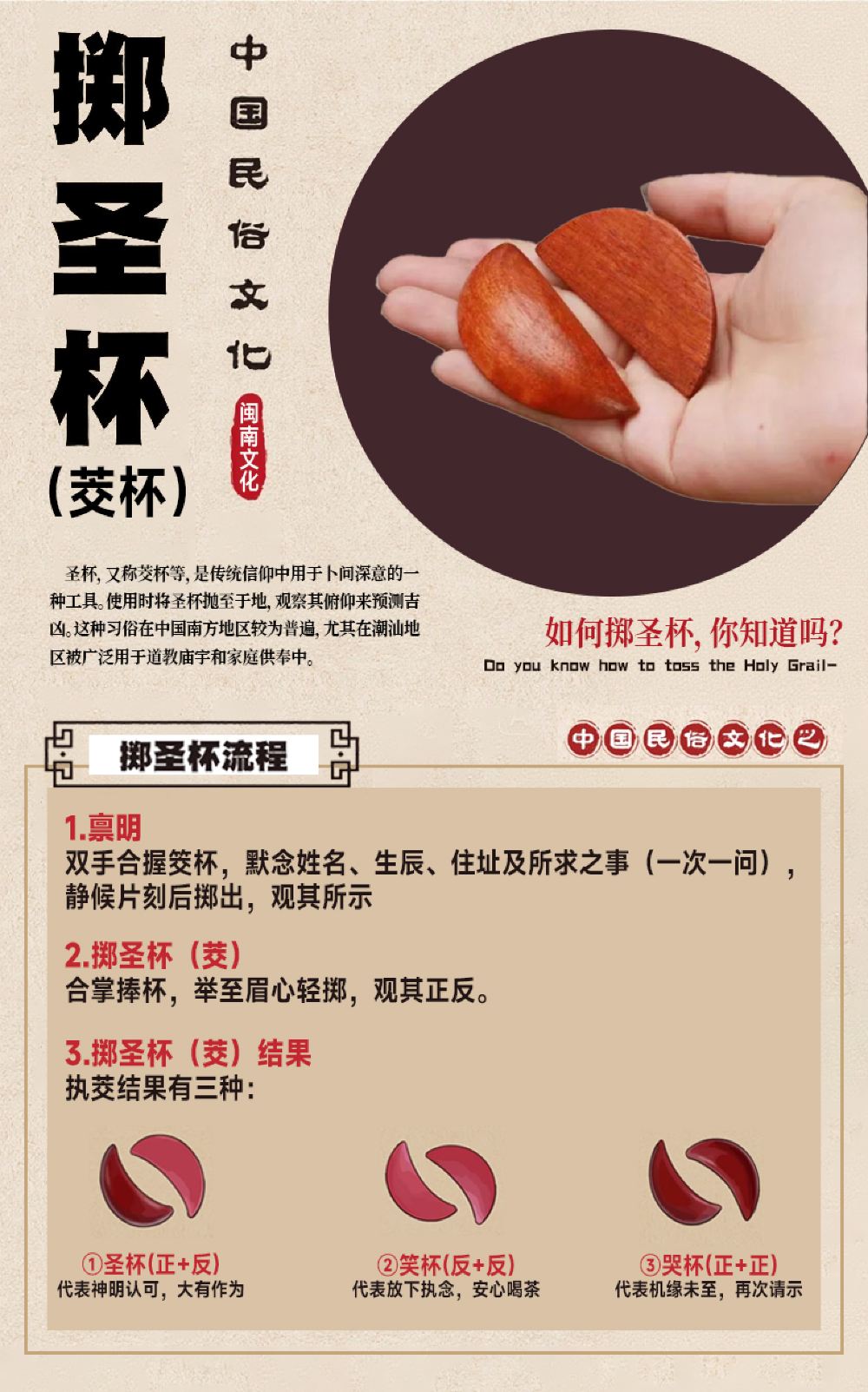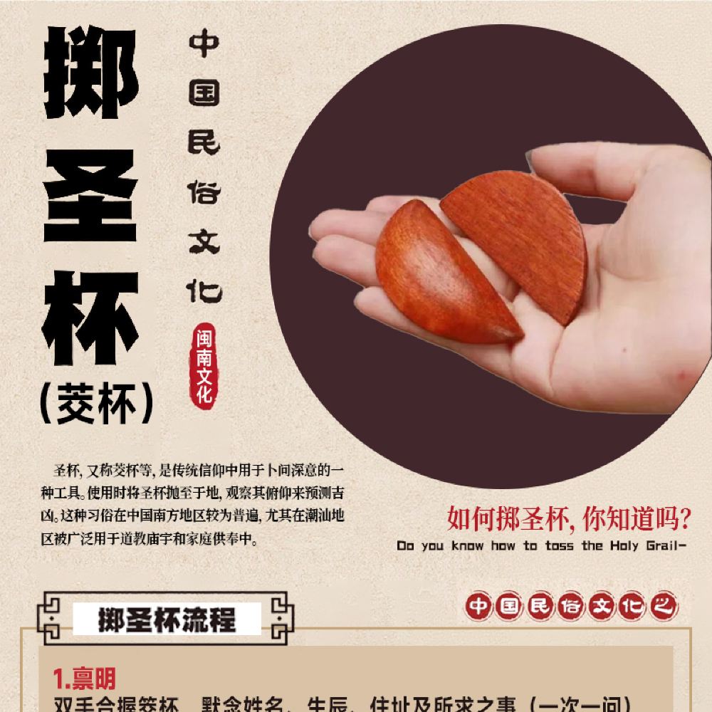 - 由两块半月形木片组成,是庙宇祈福、家族祭祀 “问神意” 的传统工具: