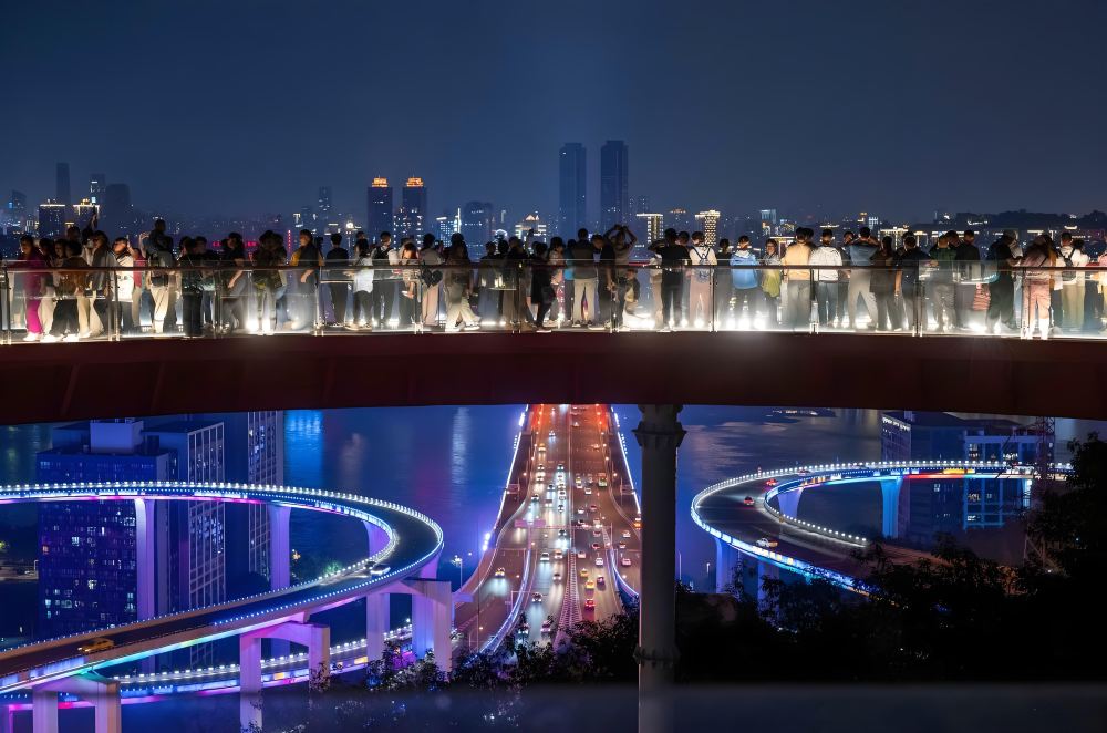 ▲ 铜元之光观景台位于重庆市南岸区铜元局苏家坝立交桥上方,因其独特的地理位置和270度超大视角,成为重庆的热门打卡之地。观景台悬空在半空中,视野开阔,可以俯瞰长江两岸的壮丽风景,特别是70多米高的苏家坝立交桥,以720度的大回旋串联起铜元局街道的上下半城,展现了重庆山水之城的独特魅力。