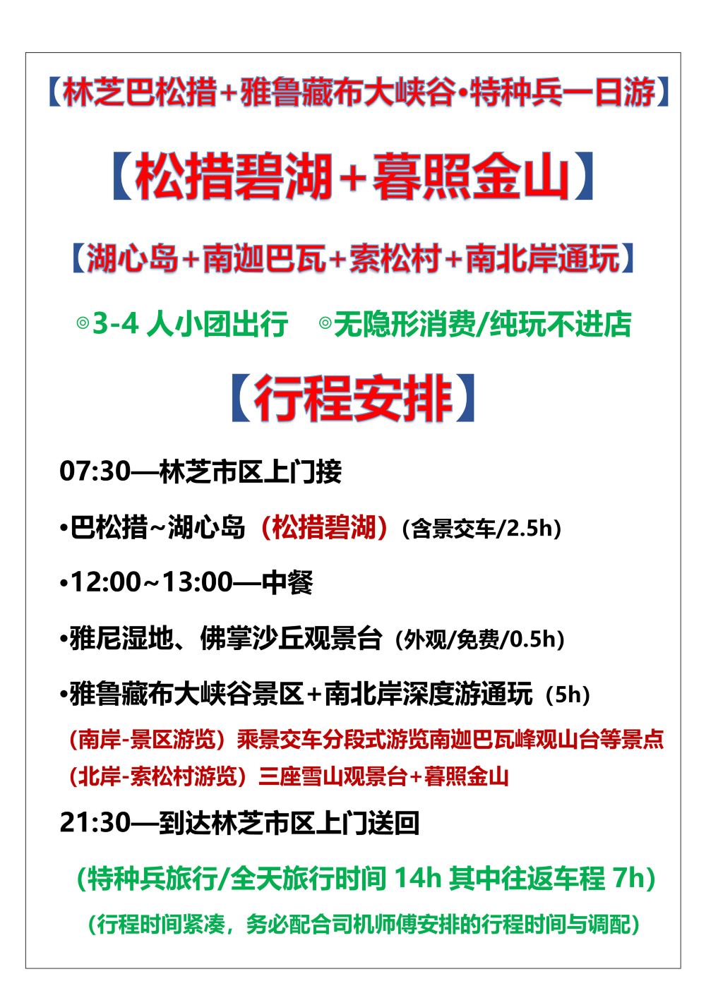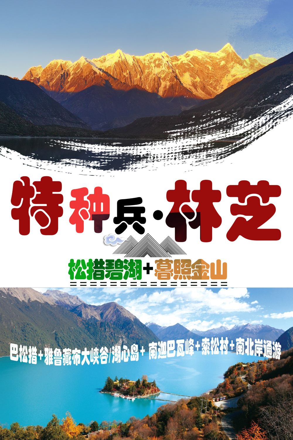 特种兵·西藏林芝巴松措雅鲁藏布大峡谷南迦巴瓦暮照金山一日游【特种兵旅行、松措碧湖+暮照金山、湖心岛+南迦巴瓦+索松村+南北岸通玩】