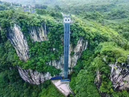 ▲ 景区内的金谷天梯高108米,是中国西南地区第一高的垂直电梯。乘电梯缓缓而上,透过透明轿厢,可从不同高度欣赏大峡谷不一样的风光。