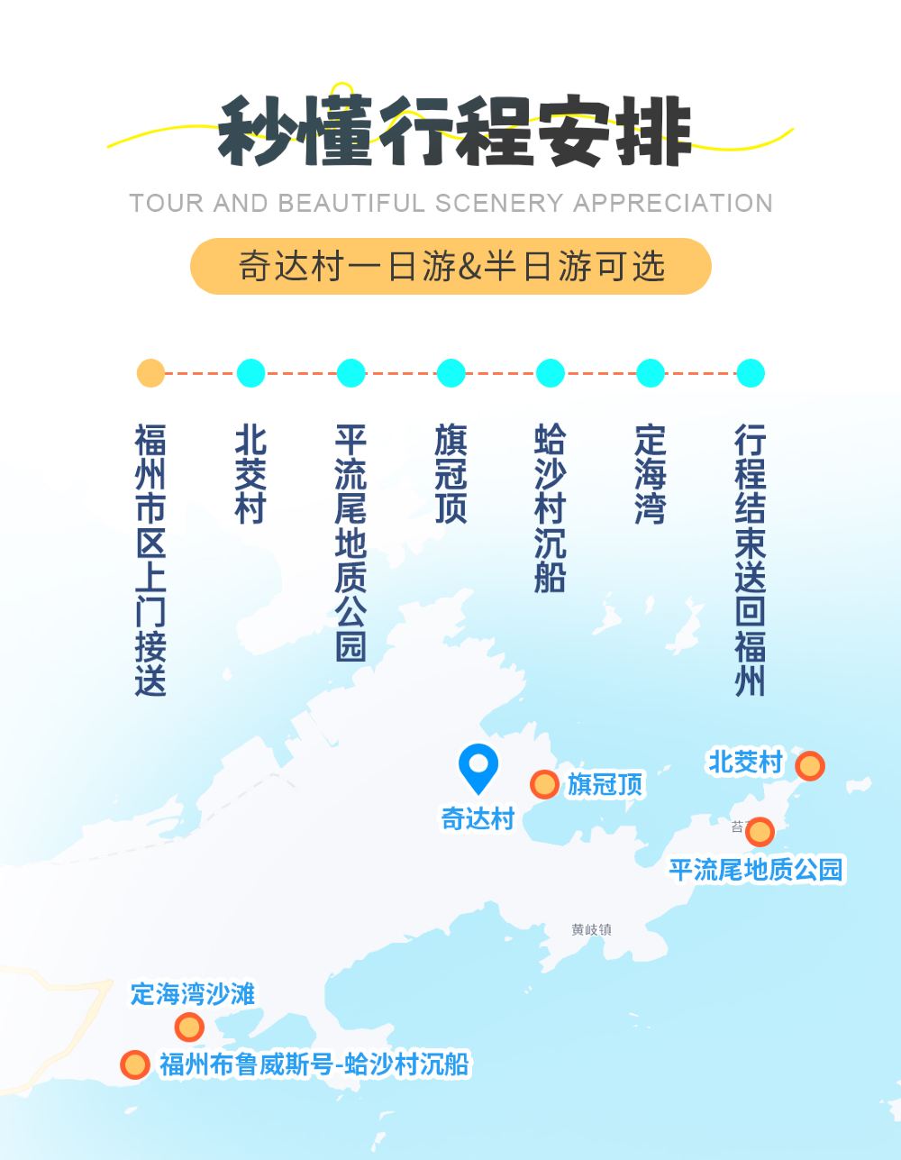 福州奇达村+旗冠顶+北茭鼻+平流尾一日游|3-6人团【2-6人精致小团,福州市区酒店上门接送,全程纯玩】