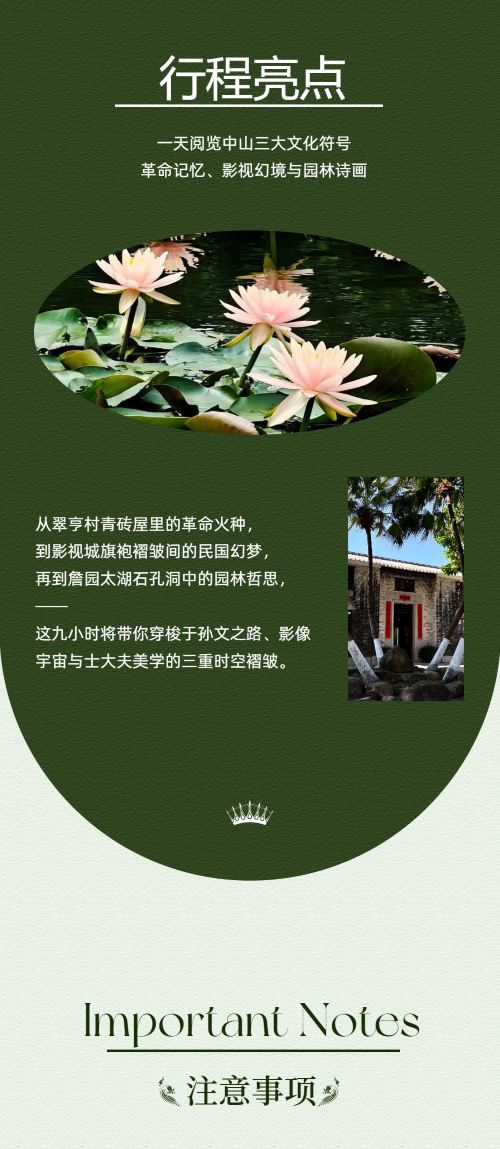 中山包车9小时一日活动|打卡孙中山故居+詹园+影视城+崖口村【专车高效衔接故居、影视城与古典园林,深度体验中山多元人文魅力】