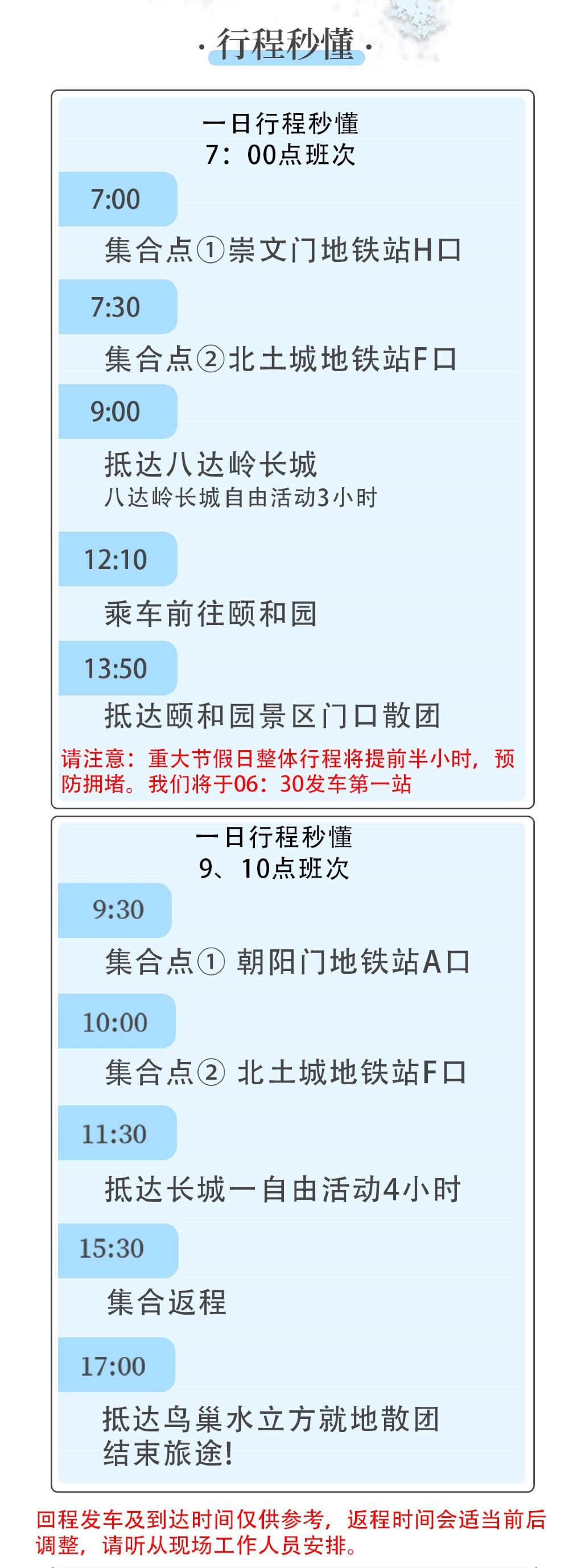 早起集合遇到早高峰,不想坐地铁感受“人从众”,我们还提供五环内上门接服务,3人起接,从您的家里集合点八达岭,省心省力;