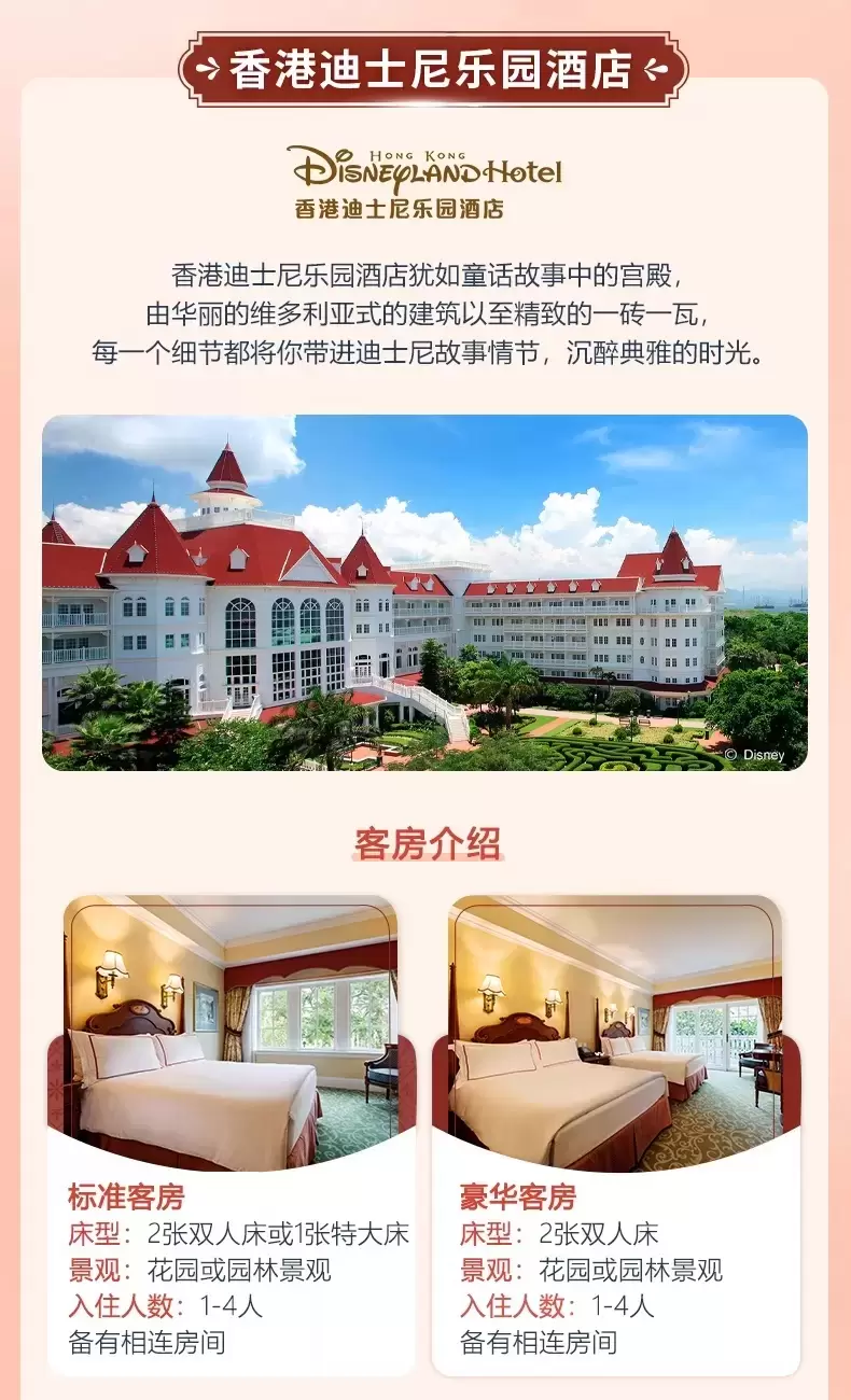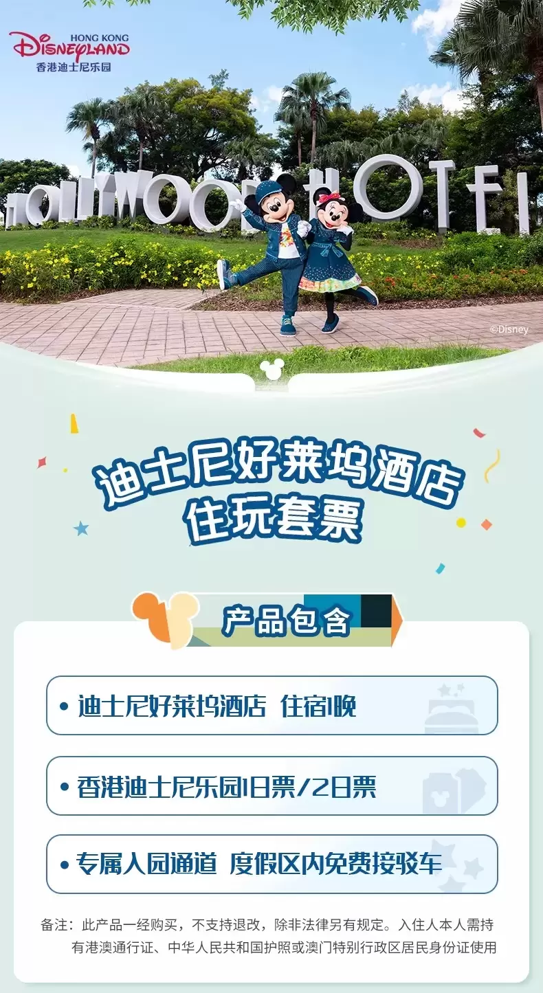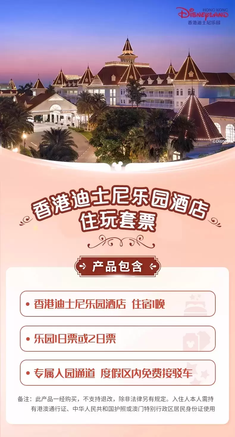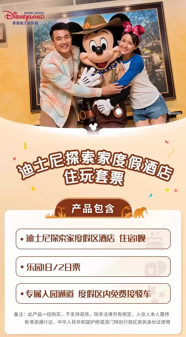 【迪士尼官方酒店】香港迪士尼探索家/好莱坞/迪士尼乐园酒店2天1晚+香港迪士尼乐园门票1日/2日票+免费接驳车