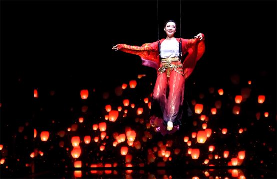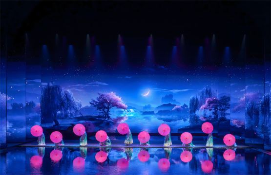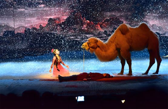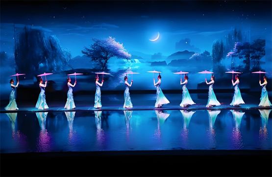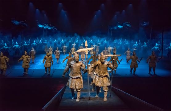 大型歌舞《西安千古情》以一位华裔少女回国寻根的故事为主线,开启一次寻找民族记忆之旅,犹如神奇的时空穿梭机,全面立体展现周秦汉唐的宏大篇章。这里有苍茫古远的半坡之光,这里有灞柳依依的浪漫诗情,这里有泱泱大秦的风骨气魄,这里有万里扬沙的丝路传奇,这里有大唐长安的盛世华章……高科技机械与设备满场运转,三千吨大洪水倾泻而下,数百立方黄沙扑面而来,用虚实结合的表现手法打破舞台与观众区域的界限,沉浸式地感受一次穿越之旅。