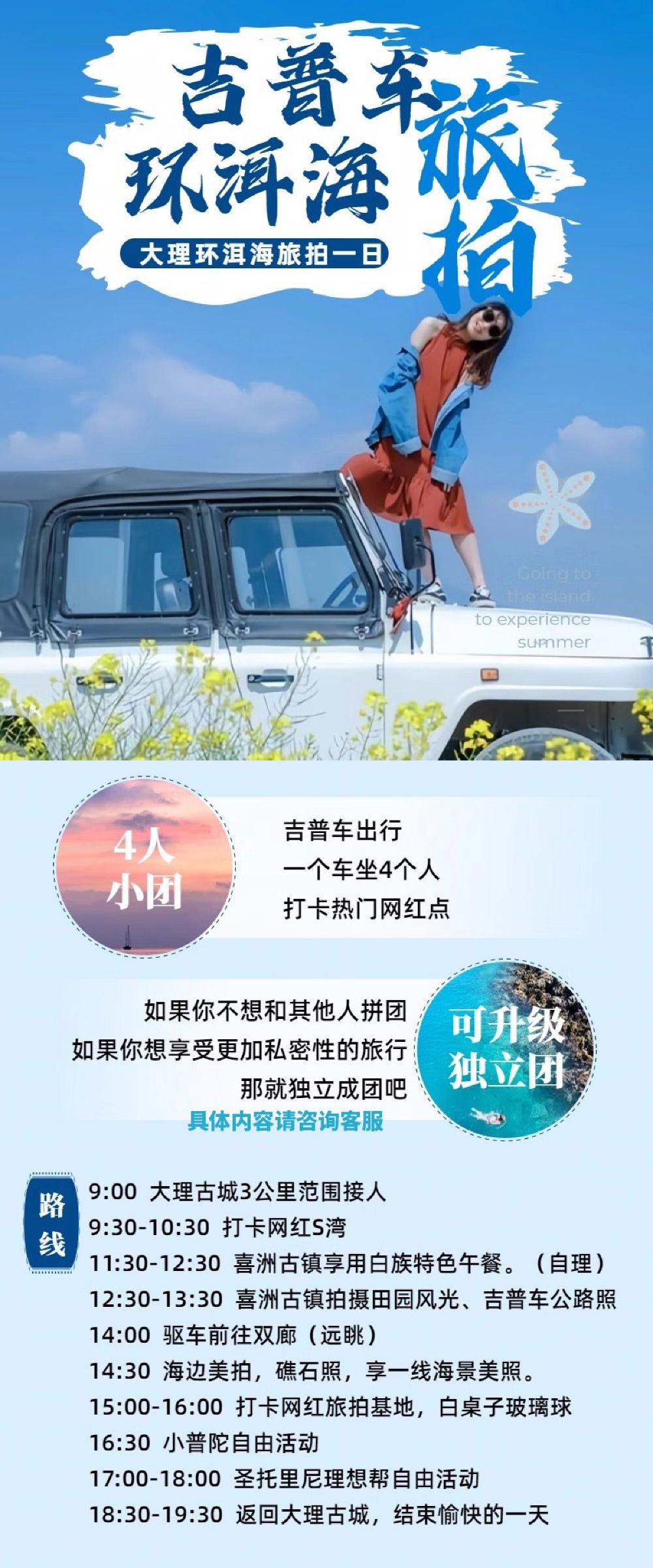 云南大理洱海旅拍一日游【吉普车+环洱海+底片全送+网红道具】【[边拍边玩]360°环洱海,全程自由行,随走随停,纯玩无购物,餐饮自选】