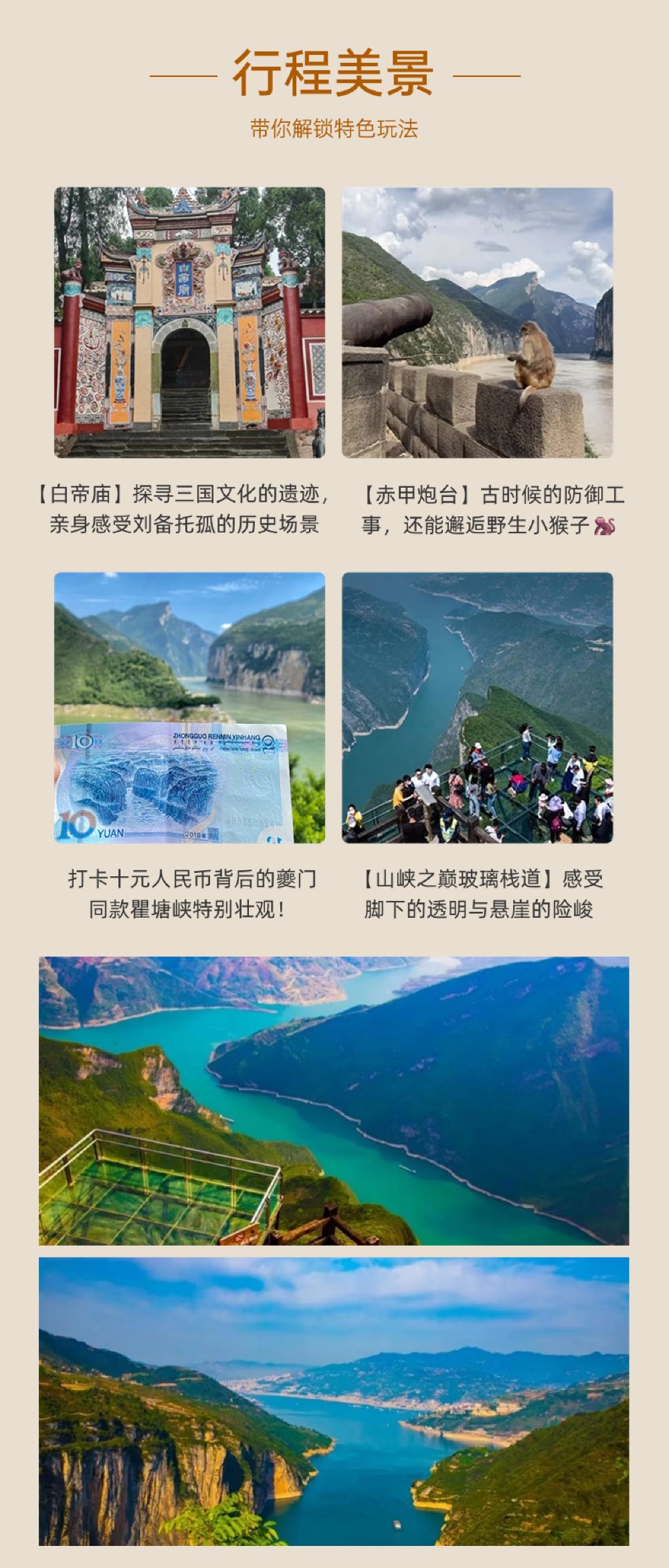 1.此为私家小团,不与其他游客拼团,根据出行人数选择对应套餐拍对应份数(如2人拍2人私家团拍2份,3人拍3人私家团拍3份),费用包含白帝城门票、瞿塘峡深度游船、三峡之巅观光车。