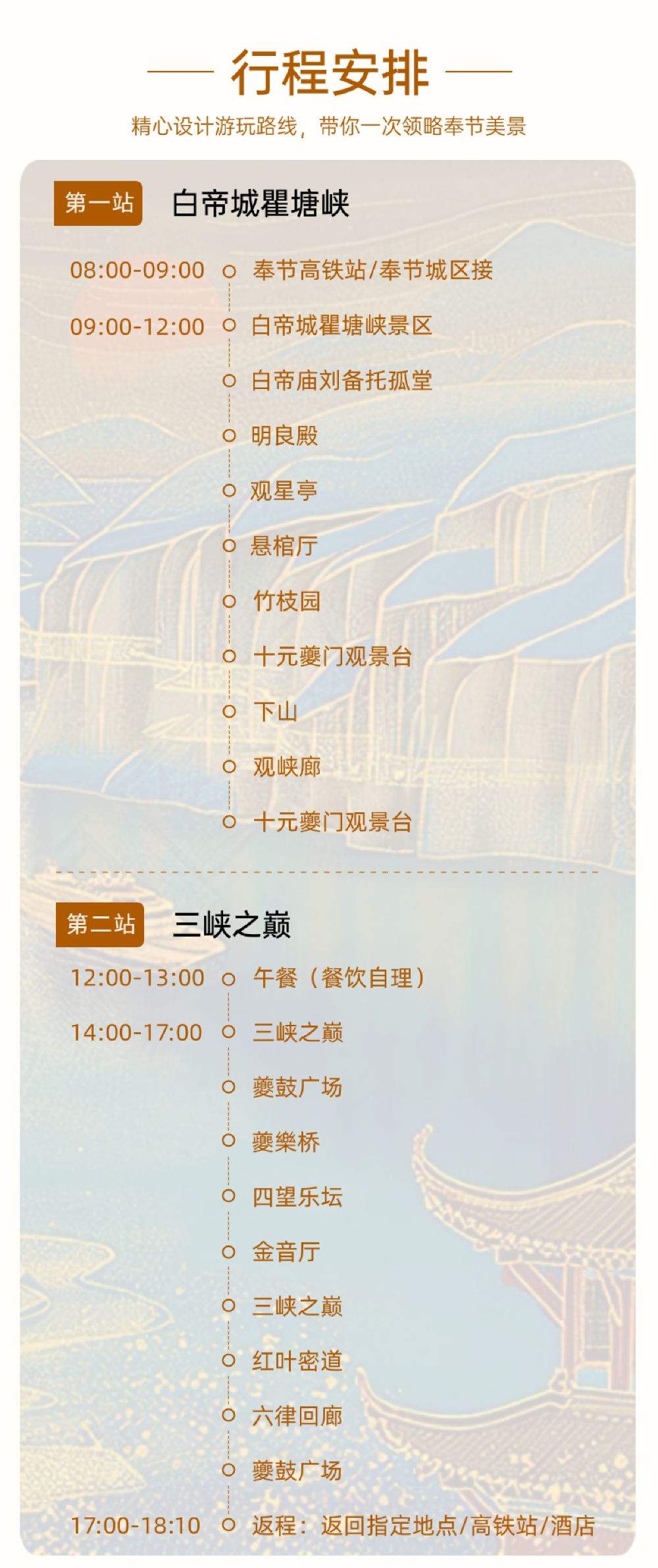 2.需要自行购买重庆-奉节往返高铁票,为保证游玩时间,建议9:00之前抵达奉节站,返程高铁票建议购买18:00之后的车次;10:00之前车次也可接,但返程建议购买19:00之后的车次。