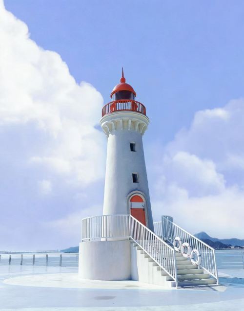 ▲ 深门海角灯塔,灯塔为白色塔身、红色塔顶,矗立在海边,造型美观。其周边有免费的划线停车位,还设有小型儿童游乐场、彩色跑道等设施。灯塔附近适合露营、垂钓,是观赏日落的好去处,吸引了众多游客前来打卡拍照。