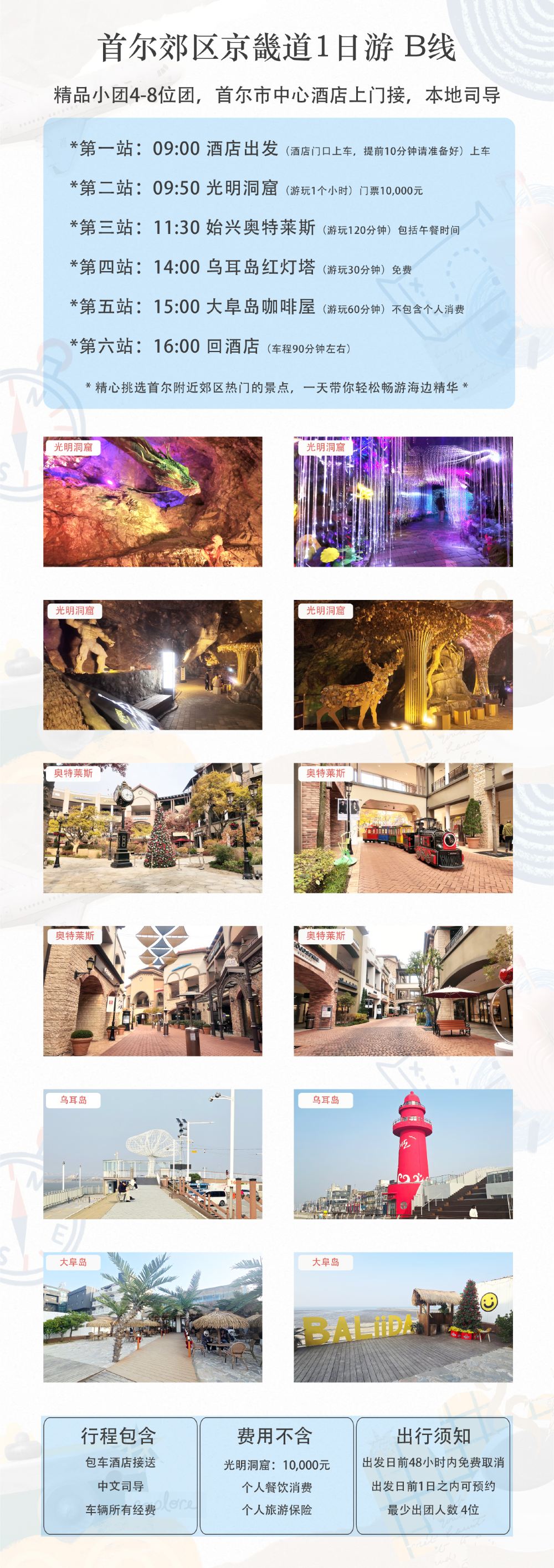 首尔附近京畿道1日游拼车【光明洞+奥特莱斯+乌耳岛+大阜岛】【光明洞是韩国由废弃矿坑改造而成的主题洞窟景点,以“光与艺术”为主题,将自然洞窟、灯光艺术、历史展示】