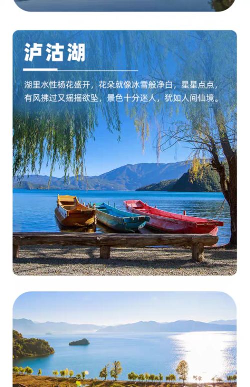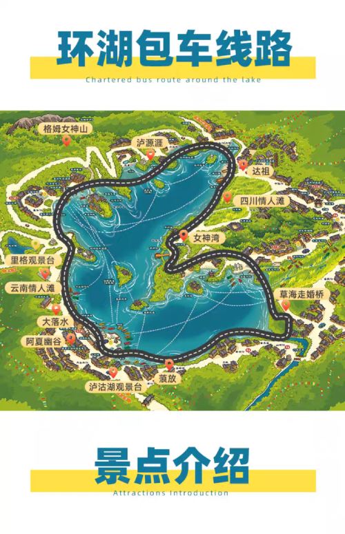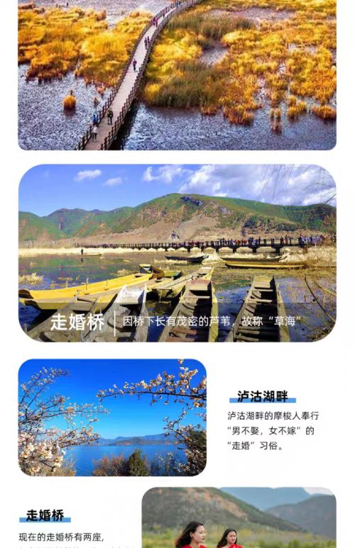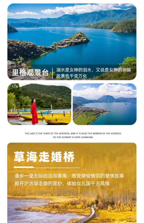 2.页面的行程时间与景点为本次私家团的行程推荐,(大落水村——吕家湾沙滩——花海码头(看水性杨花)——草海走婚桥——女神湾——四川情人滩——泸源涯——小落水观景台——里格——云南情人滩——大落水(结束行程)就地散团,如需第二天可以联系客服和师傅继续补差价游玩第二天))如无额外指定行程将按此线路安排,景点顺序可能根据实际情况前后调整,行程及标注时间仅供参考,具体以实际选择路线和路况及当天安排为准,如遇节假日黄金周期间堵车,结束时间会比较晚,敬请谅解!